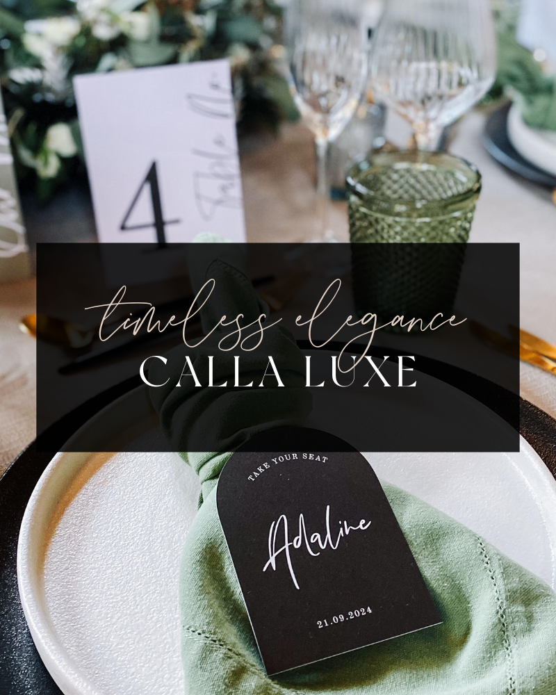 The Calla Luxe suite is elegant and refined with a modern script for that classic but stylish couple! Ranging from save the dates to invitations and a range of on the day stationery and signage items. Customise in any colour and shape combinations to suit your wedding style.