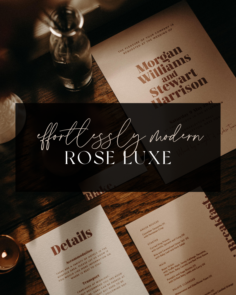 Bold but effortlessly modern, the Rose Luxe suite combines bold type and soft colours for a chic and romantic finish. Ranging from save the dates to invitations and a range of on the day stationery and signage items. Customise in any colour and shape combinations to suit your wedding style.