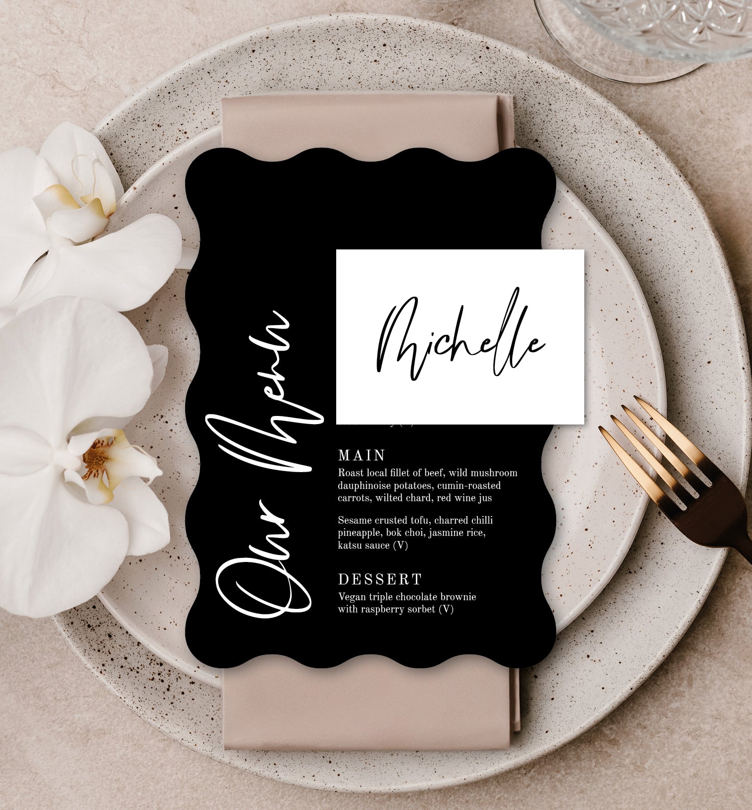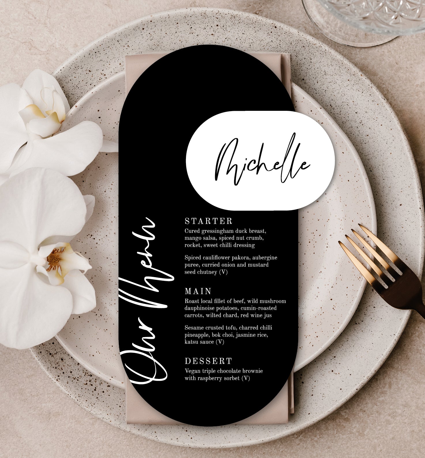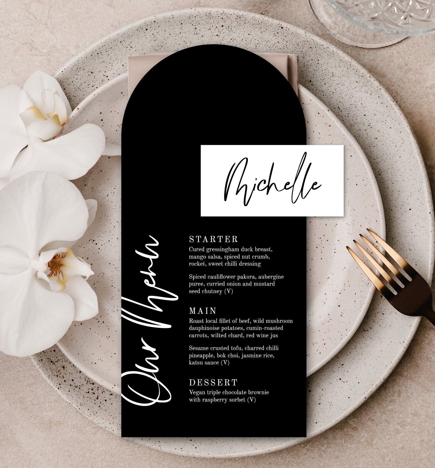Menu card and place card in your chosen shapes and colours. Customisation of shapes, text/sections and colours are allowed.