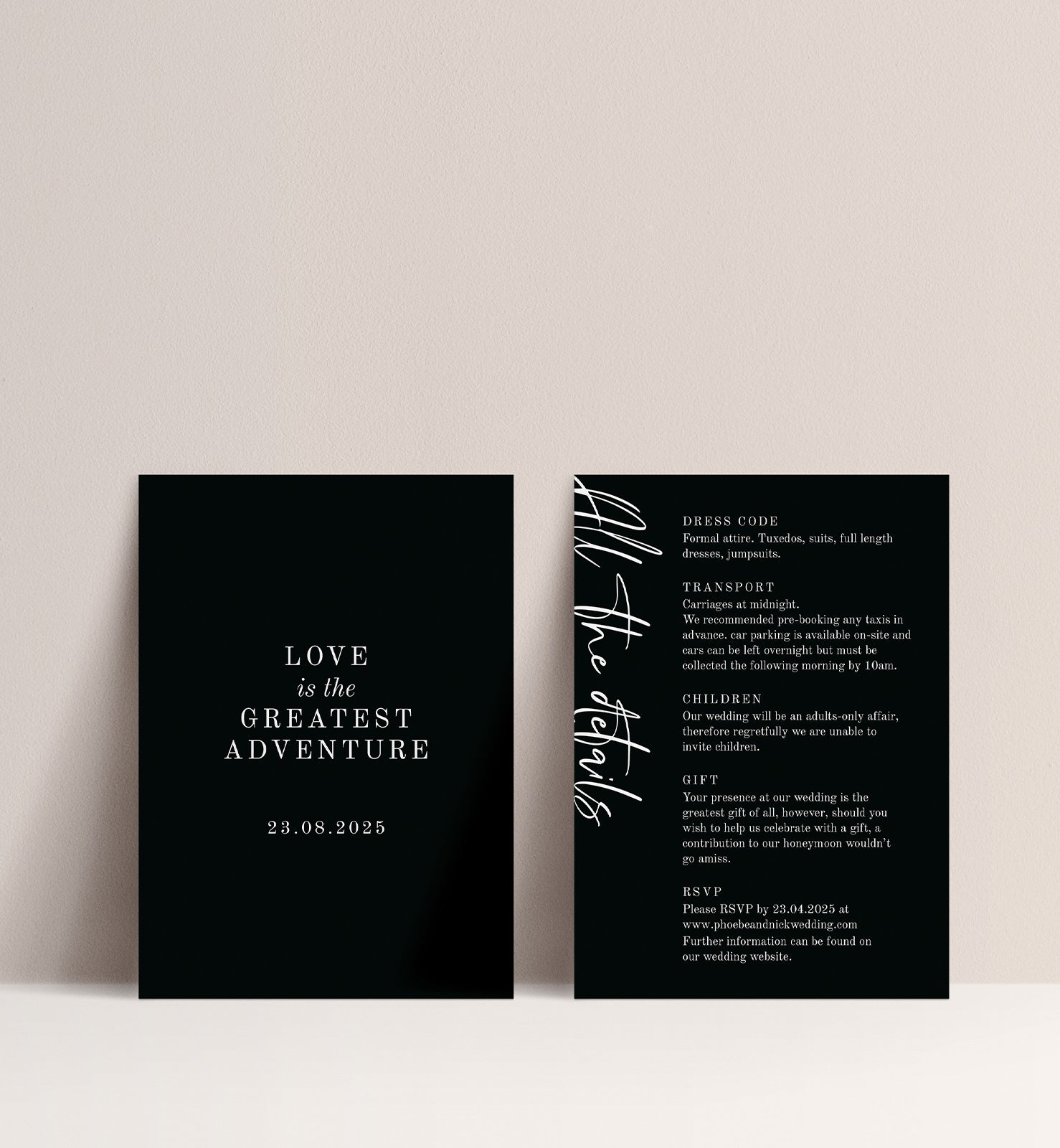 Invitation (127x178mm), Details card (A6). All packages come with plain white invitation envelopes.