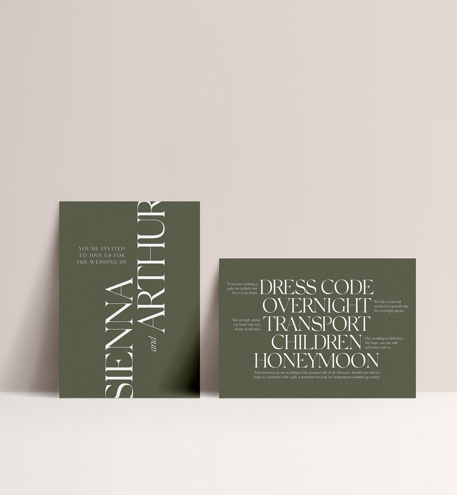 Invitation (127x178mm), Details card (A6) and RSVP card (A6, A7 or 105x105mm). Sizes and shapes will be confirmed on proofing depending on how the wording fits best to each card. All packages come with plain white invitation and RSVP envelopes.