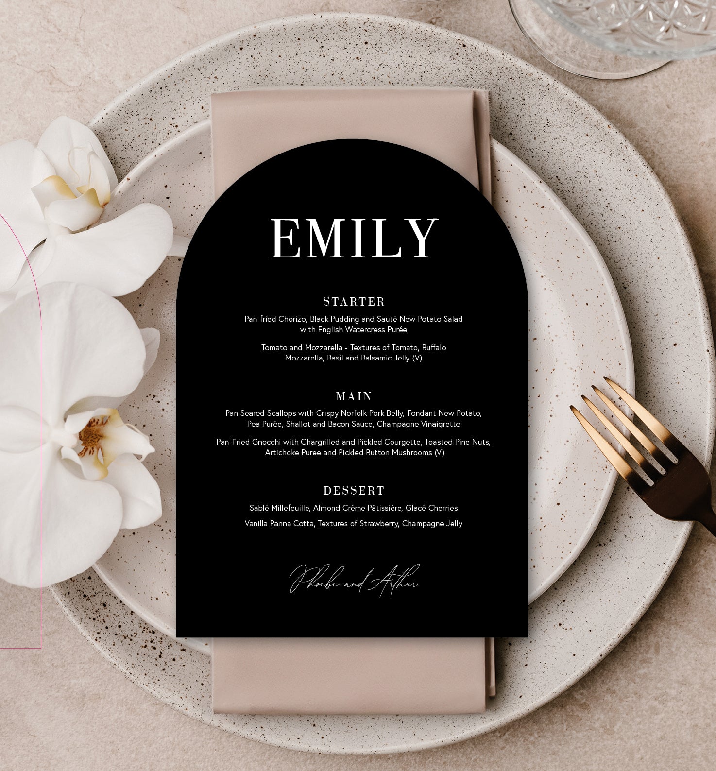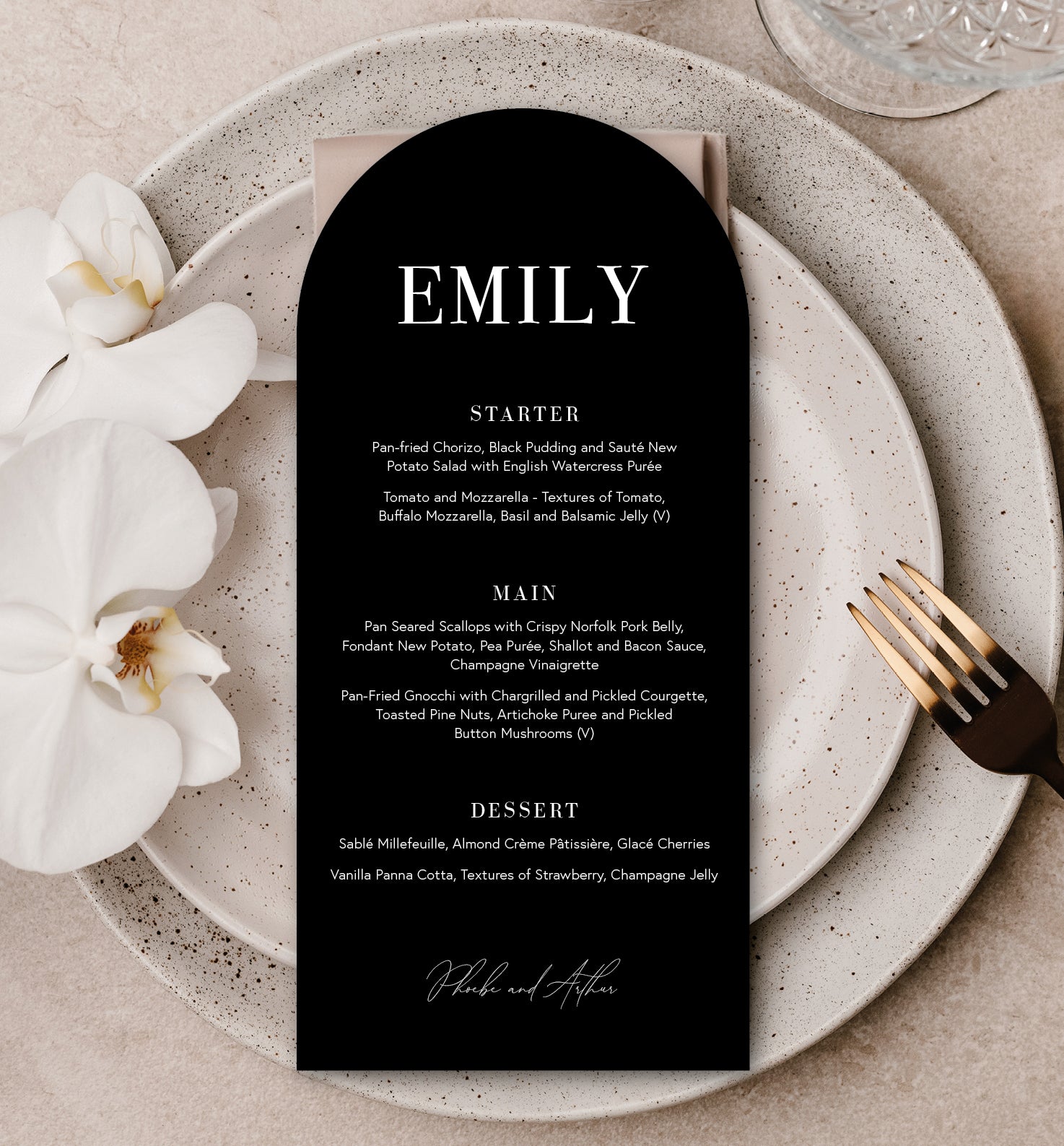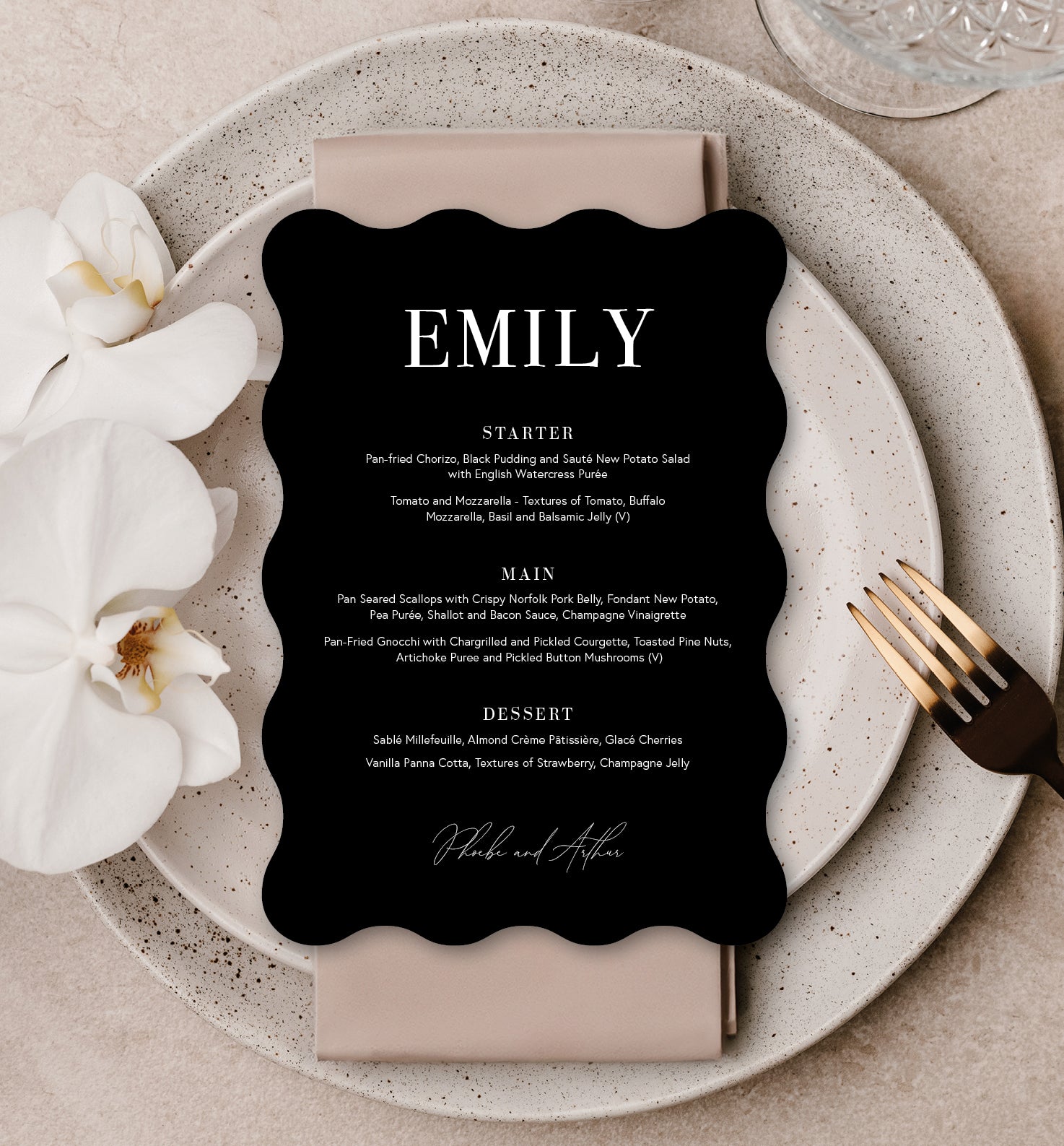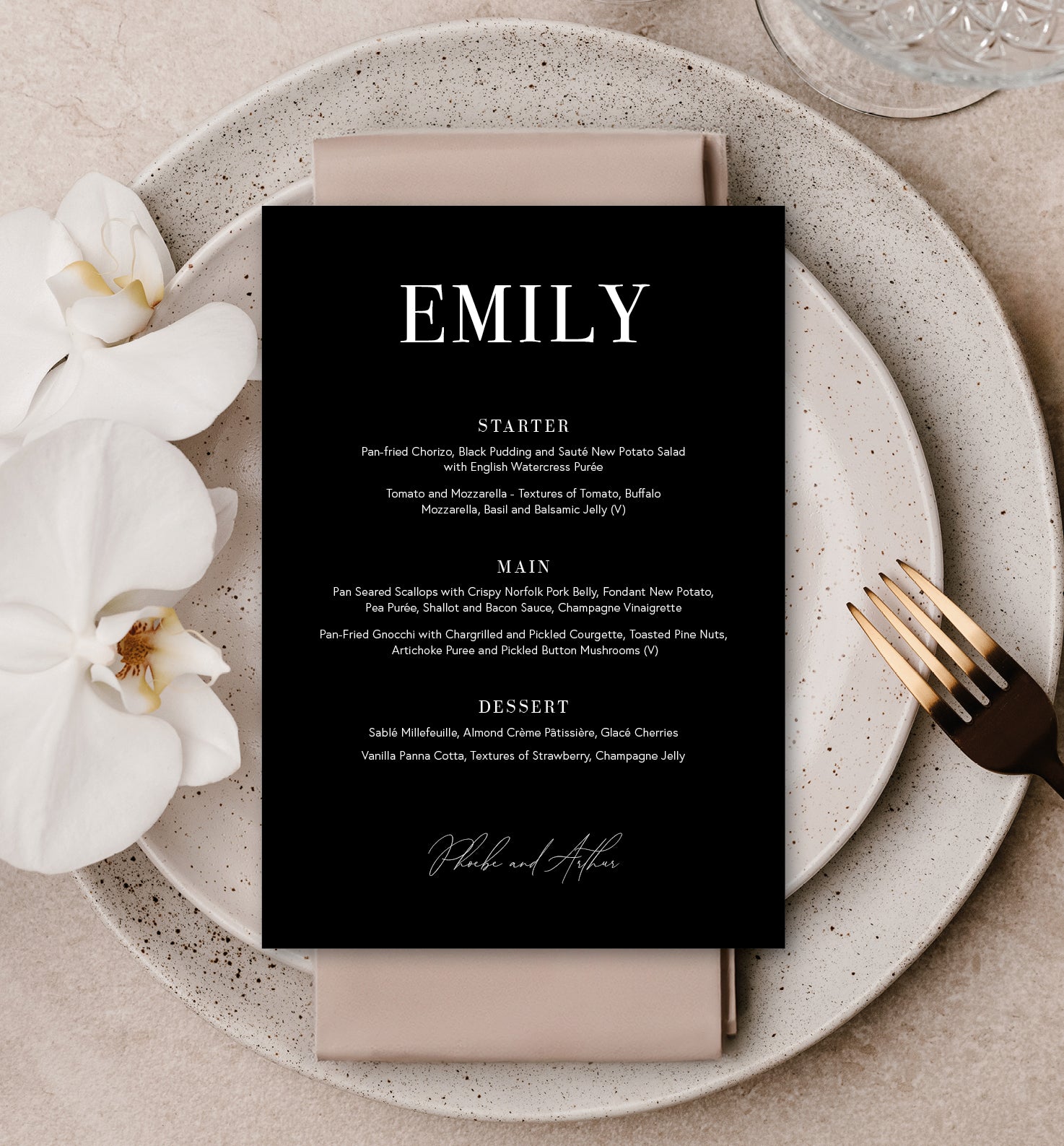 Menu card in your chosen shape and colours. Customisation of shapes, text/sections and colours are allowed.