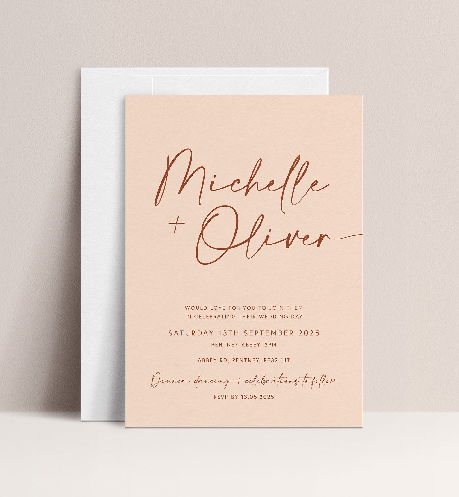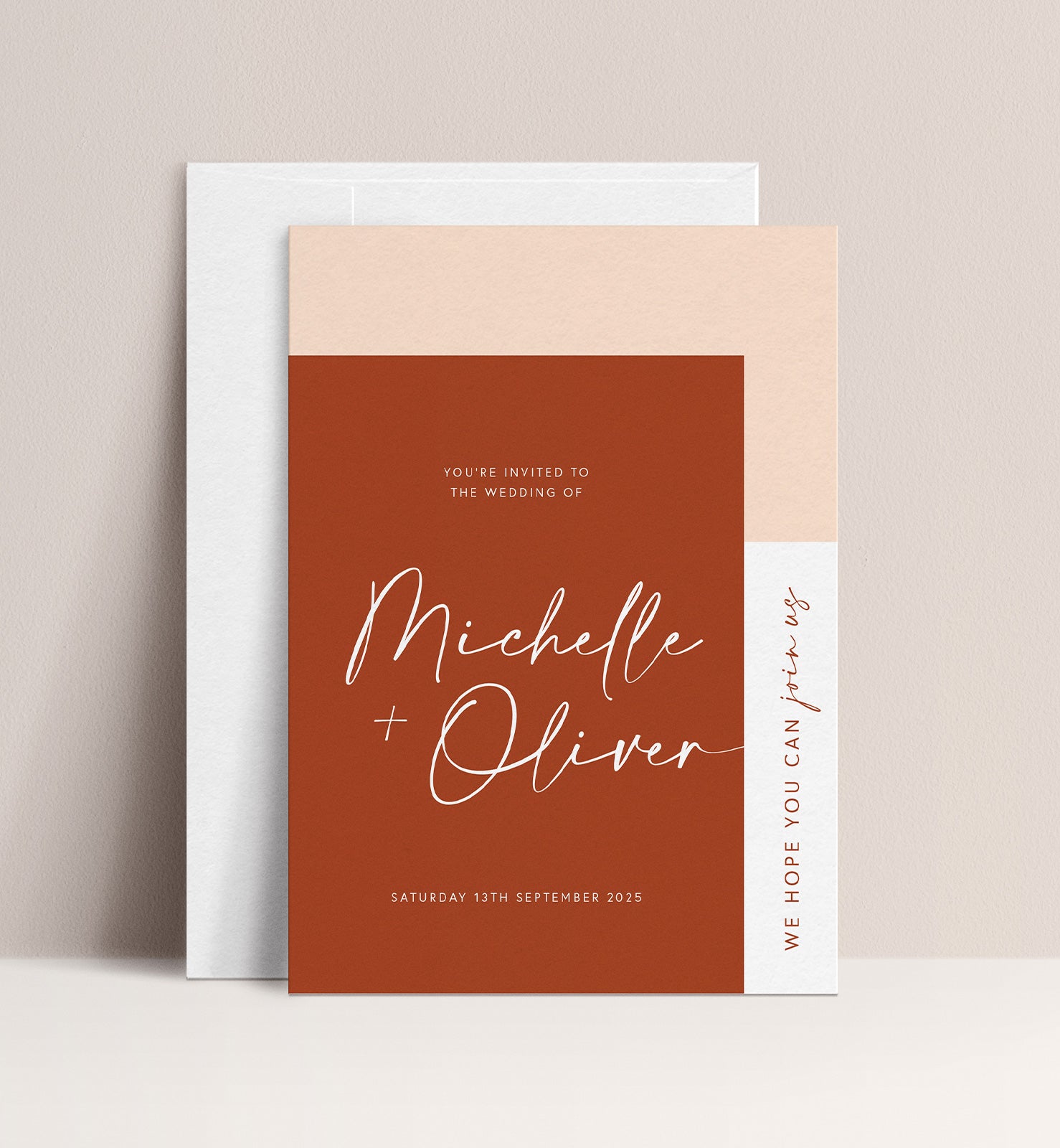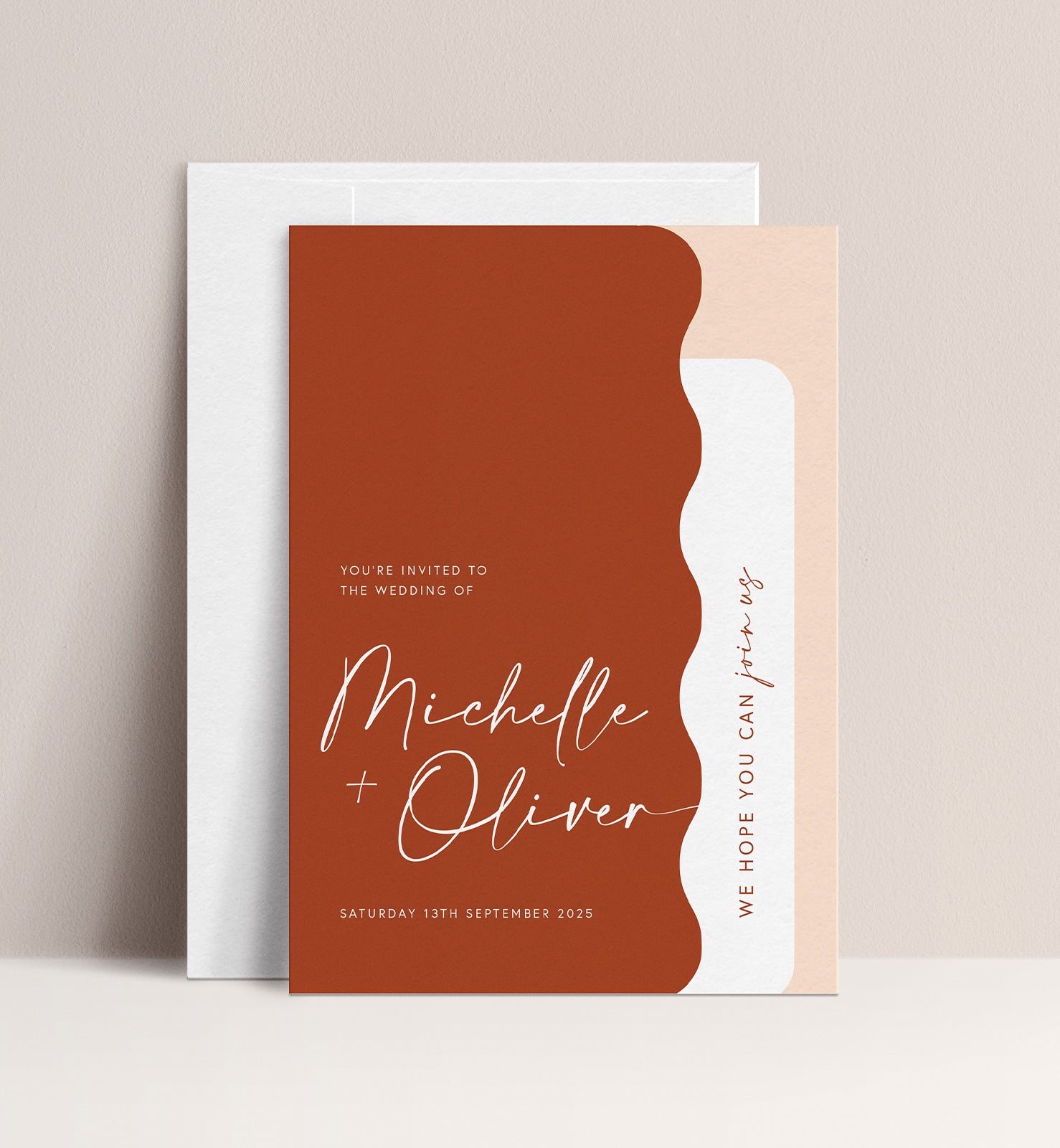 Invitation (127x178mm), Details card (A6) and RSVP card (A6, A7 or 105x105mm). Sizes and shapes will be confirmed on proofing depending on how the wording fits best to each card. All packages come with plain white invitation and RSVP envelopes.