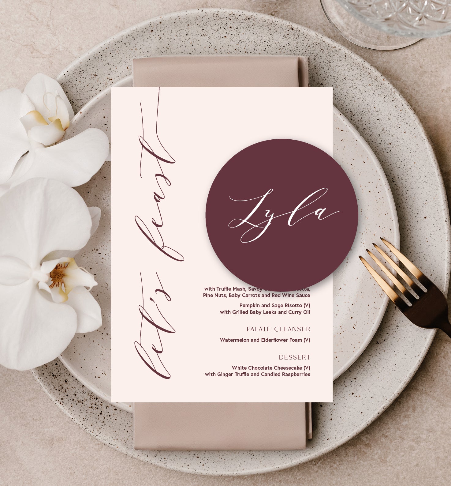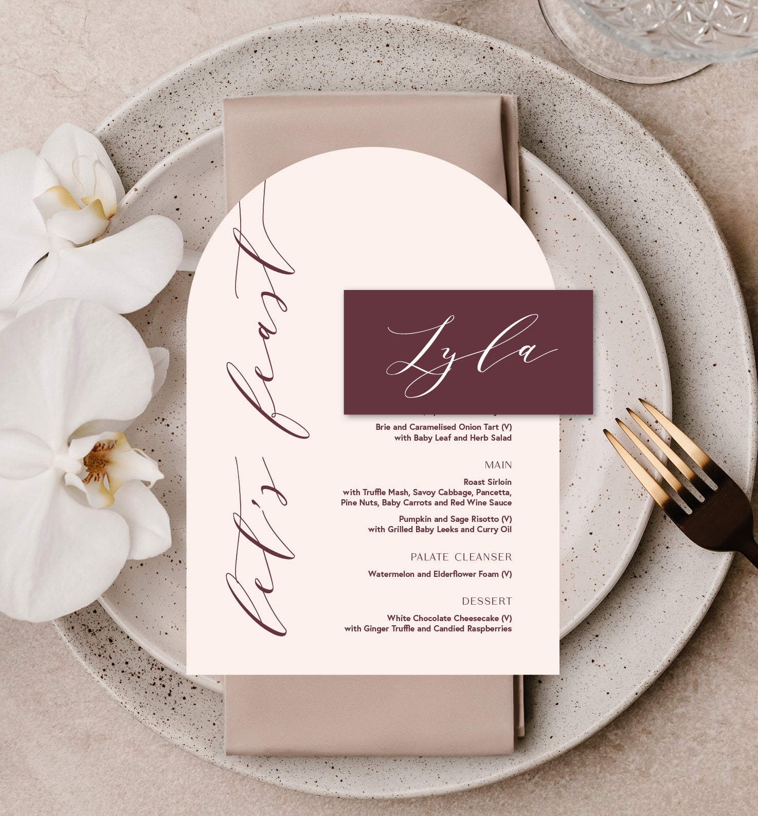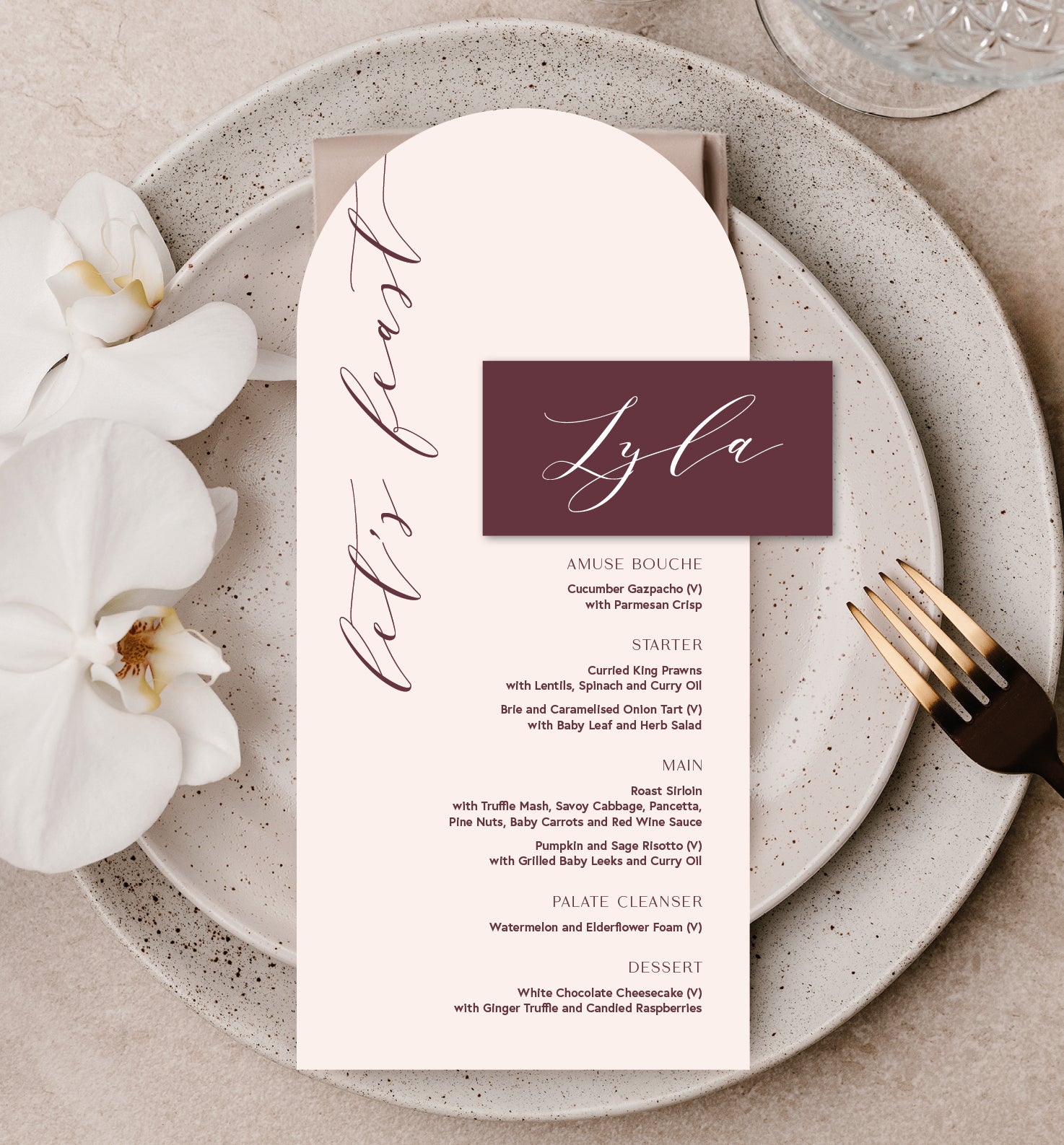 Menu card and place card in your chosen shapes and colours. Customisation of shapes, text/sections and colours are allowed.