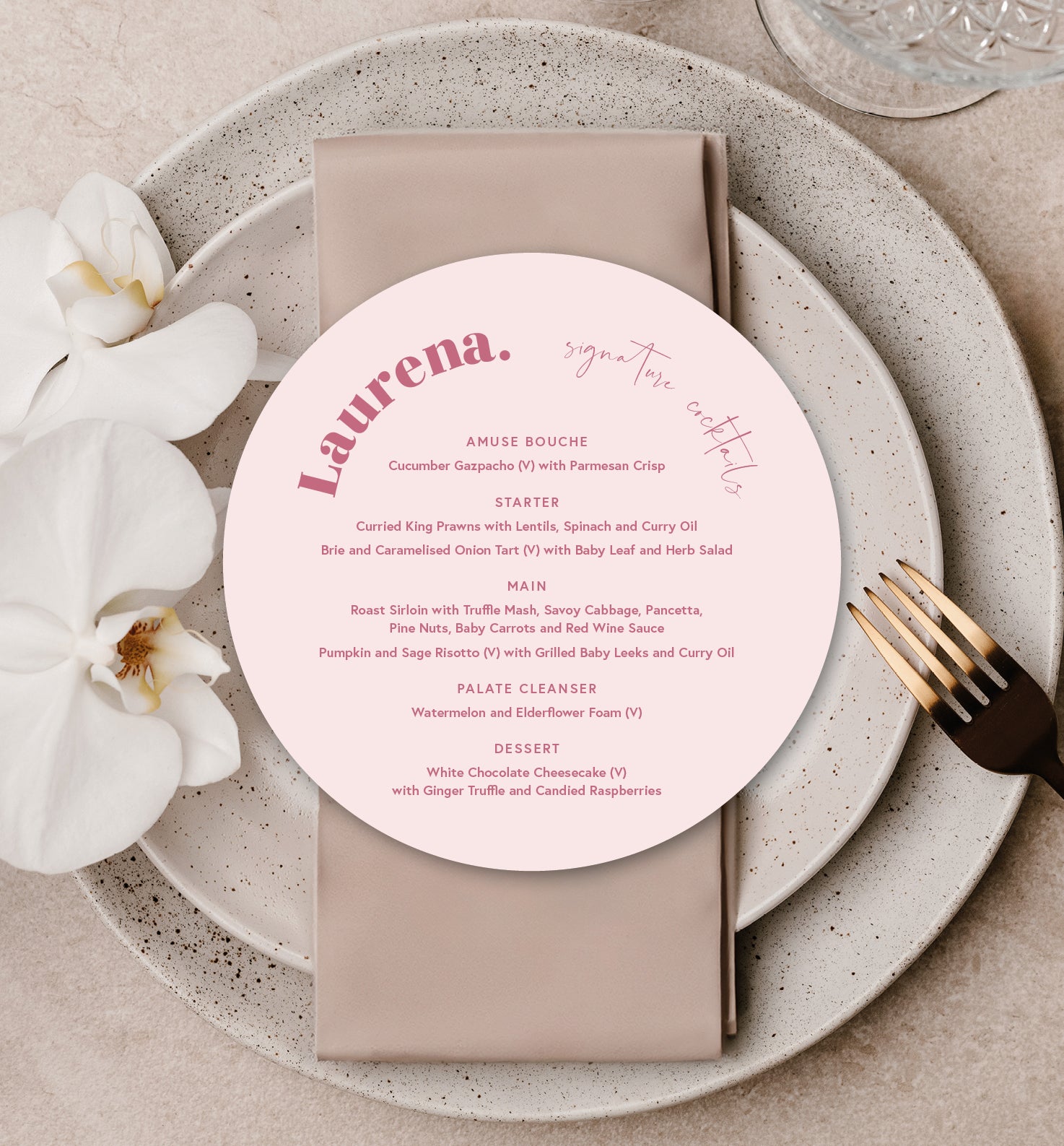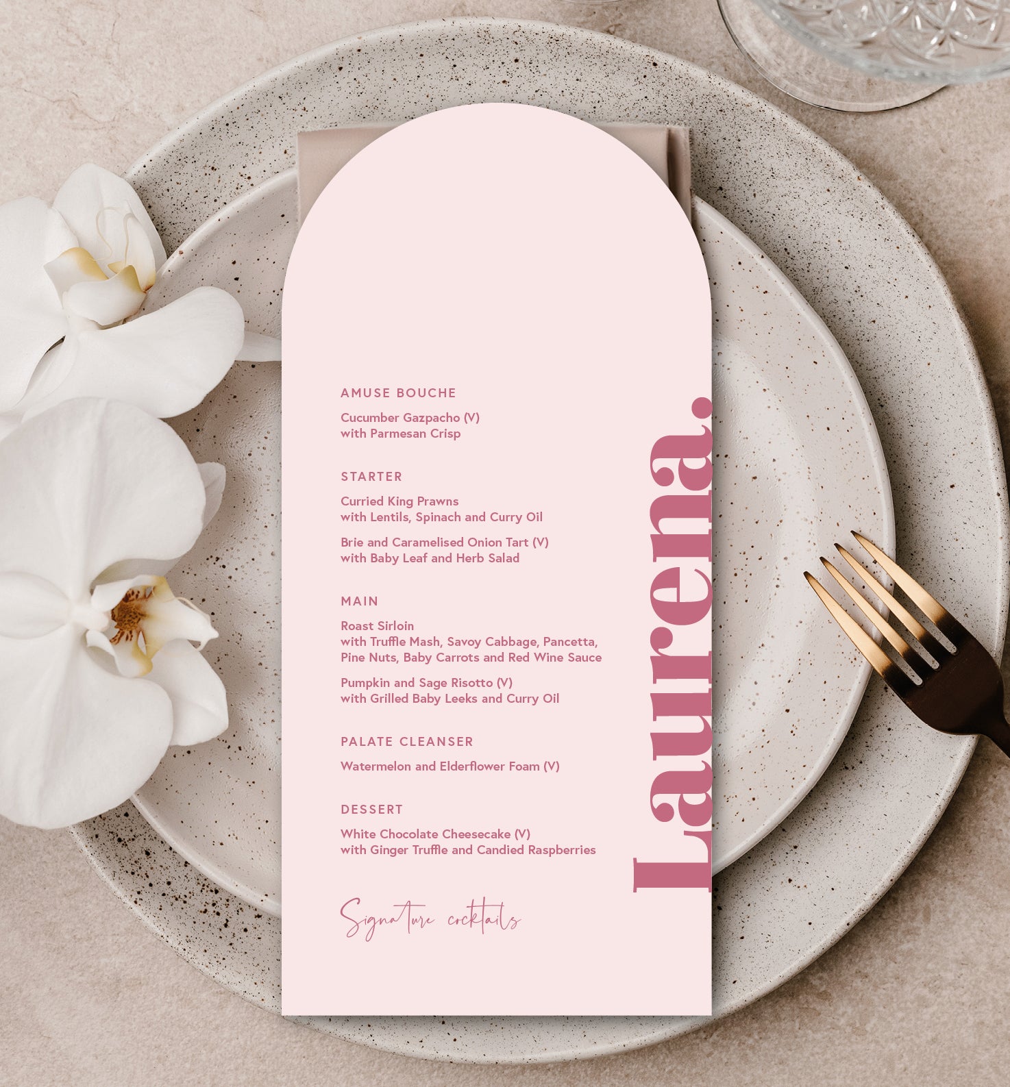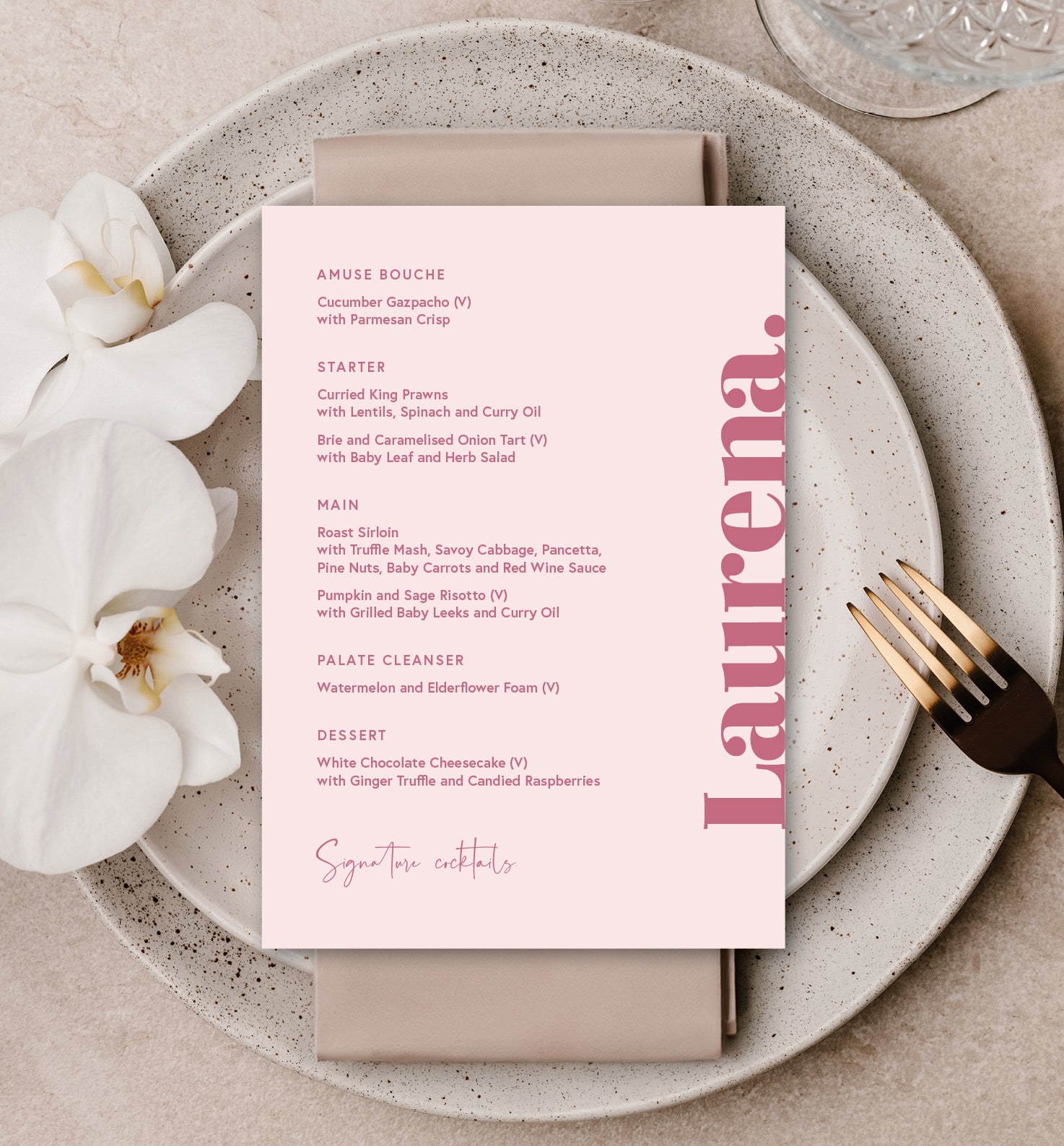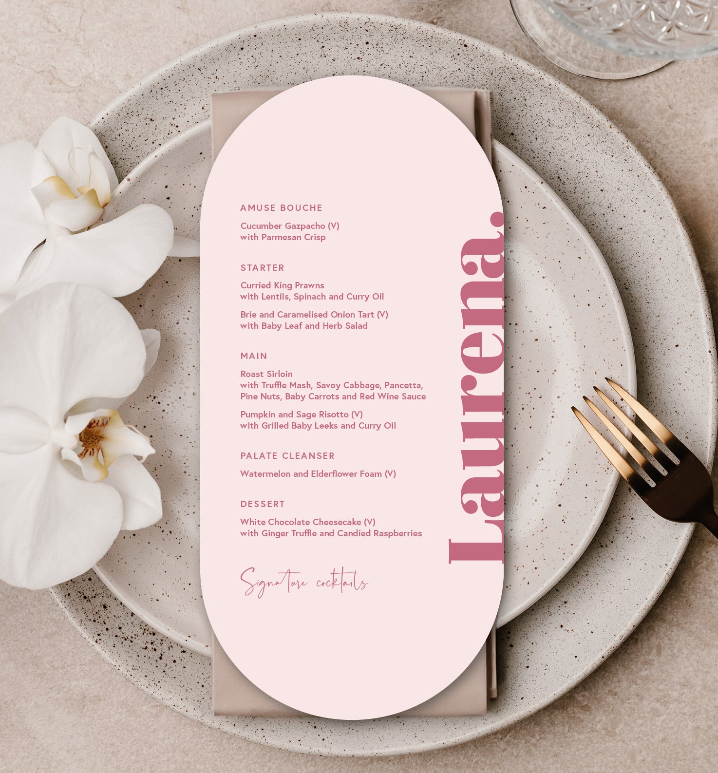 Menu card in your chosen shape and colours. Customisation of shapes, text/sections and colours are allowed.